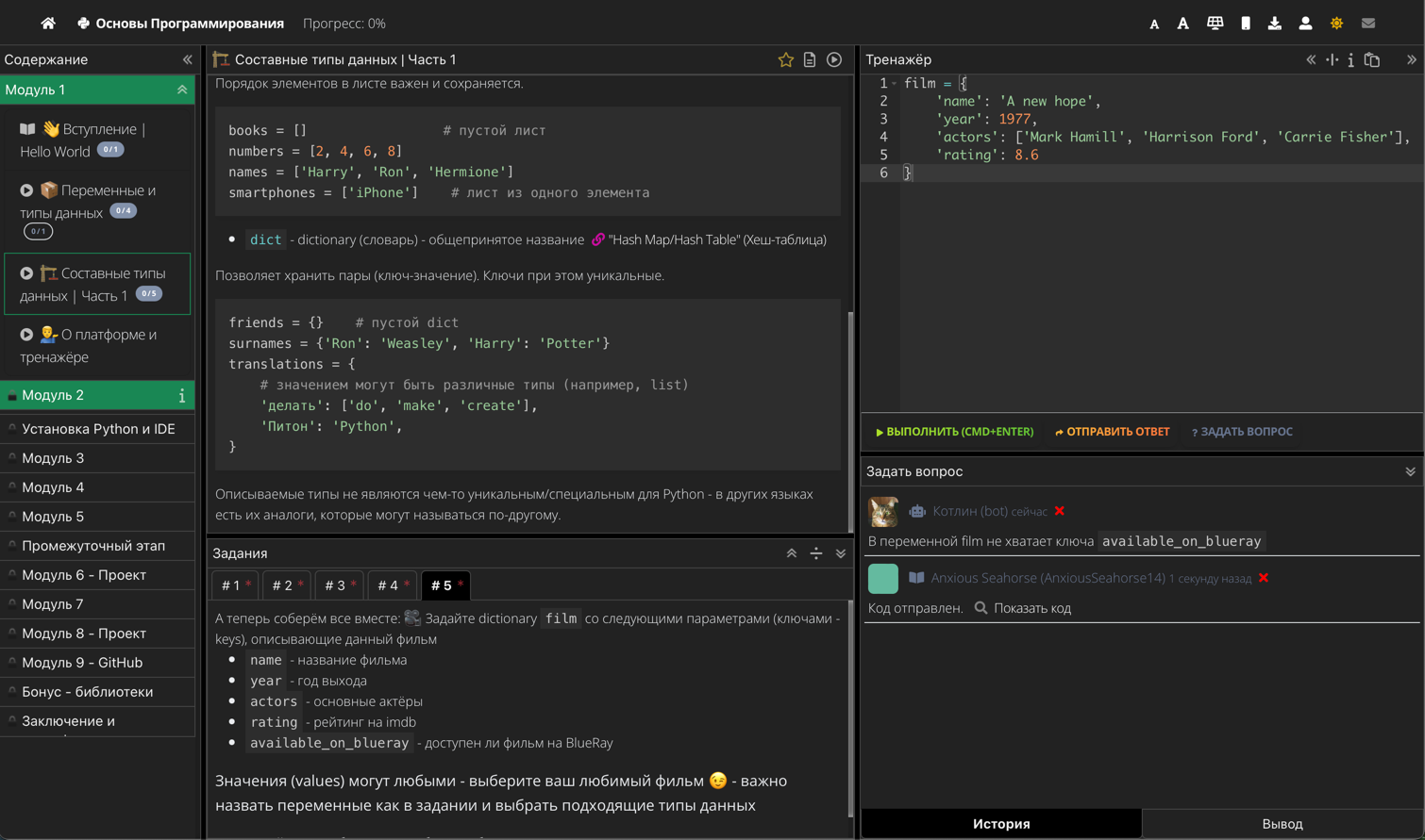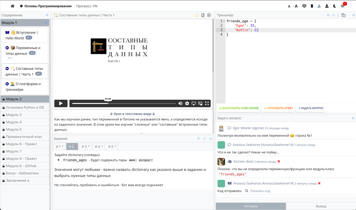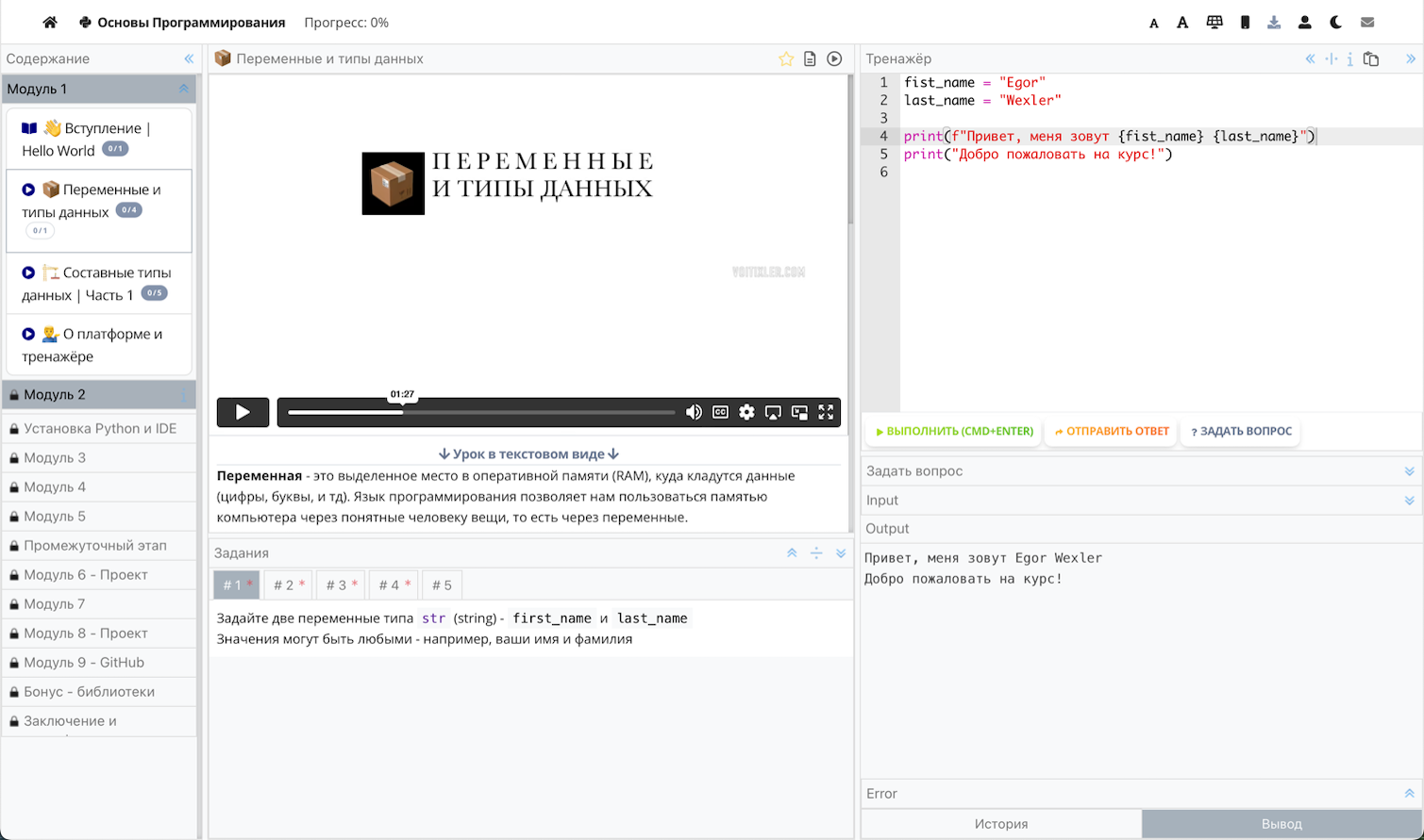 В отличие от Большого Курса Python, где вам с первых уроков надо писать код, здесь мы фокусируемся на теоретических аспектах и общем понимании того, как программировать.